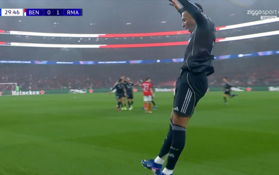 Mbappé met een snoeiharde kopbal